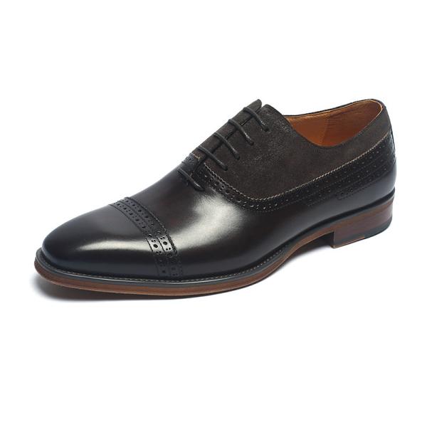 Men's black dress shoes made of high-quality top-grain leather and cow suede are perfect for many outfits. The ideal model for those who value an elegant look with fashionable accents. The decorative perforation is really beautiful and the insole is made of a high-quality pigskin which is used in luxury footwear.